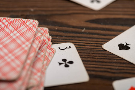 Playing cards close up, isolated on wooden table. Casino concept, risk, chance, good luck or gambling.