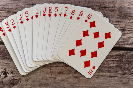 A full suit of thirteen Diamonds playing-cards laid out in a fan shape on a green baize background