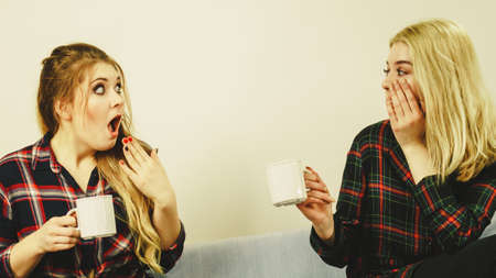 Two female friends sitting together on sofa chatting talking and drinking tea or coffee having fun spending great time.