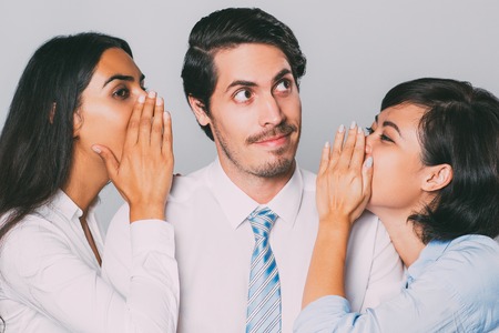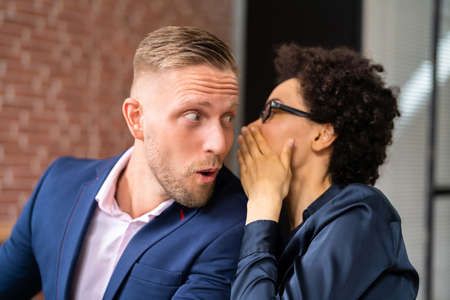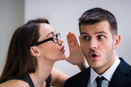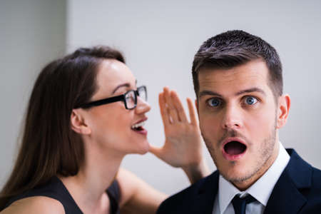 Gossips or rumors spreads among people, man and woman tells secrets, whispering and listening, hoax concept