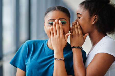 Two african woman friends in t-shirts whispers gossip indoor together.