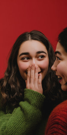 Two cheerful young women standing against a red background, with one covering her mouth while whispering a secret to the other, focusing on friendship and communication