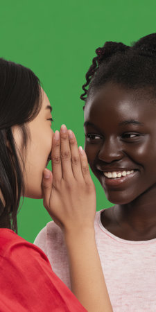 Young diverse women sharing a secret while whispering and smiling, communicating closeness and trust on a vibrant green studio background, providing copy space