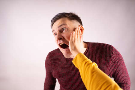 Crop person slapping scared man in face. Emotional male getting slapped in face while shouting with closed eyes in fear on white background.