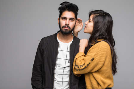 Portrait of young man and woman in casual clothes posing isolated over yellow studio background. Whispering secrets. Concept of youth, lifestyle, relationship, emotions, facial expression, ad