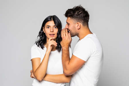 Portrait Of Happy Woman Whispering Secret Or Interesting Gossip To Handsome Man In His Ear