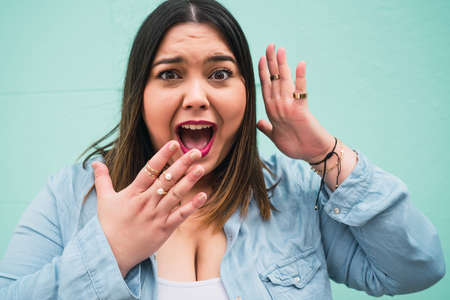Woman speaks in the ear to a friend about a great promotion. amazed expression. cyan background
