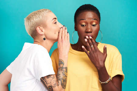 Relationship gossip. Two women multiethnic whispering secret surprised face expression, studio shot