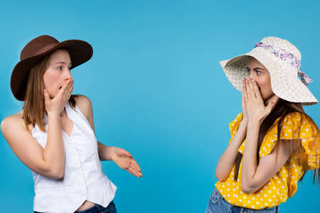 Shocked two female friends, looking to each other on blue background. Middle empty space for your advertisement text. Amazed caucasian women wearing summer clothes and hats. Sale and promotional