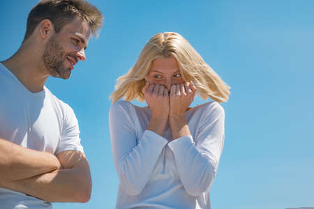 Young embarrassed lovers. Funny face. Declaration of love. Embarrassed young woman with flirting boyfriend.