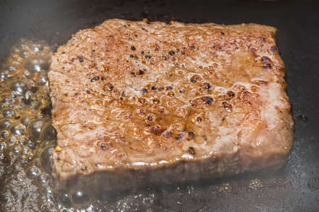 Cooking beef thigh with whole piece in a frying pan closeup roast beef, steak, sprinkled with seasoning and salt on top selective focus