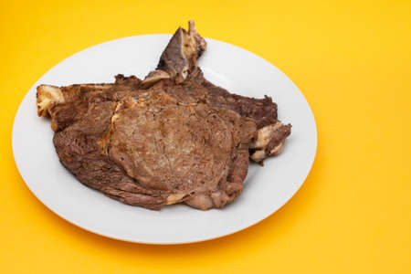 grilled fresh meat on big gray dish on yellow paper