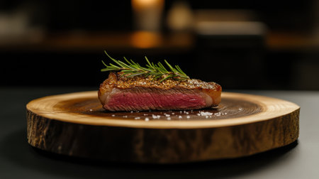 A perfectly cooked steak with a savory crust and juicy interior is displayed on a wooden board. Fresh herbs and coarse salt enhance its presentation in a relaxed dining atmosphere.
