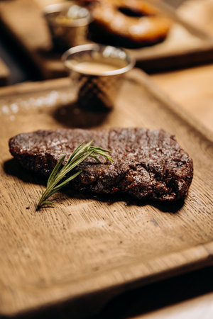 Grilled beef steak with rosemary and spices on wooden cutting board