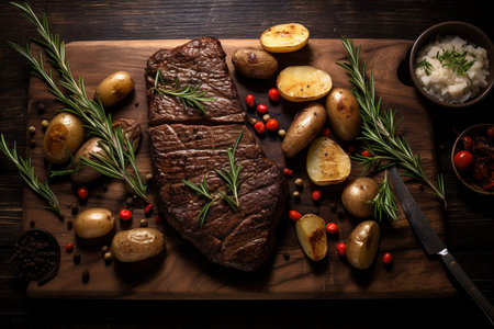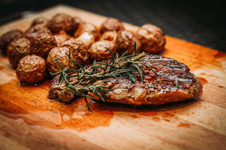 AI Generated. Grilled Steak With Rosemary and Potatoes on a Wooden Cutting Board