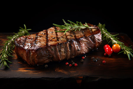 Grilled beef steak with rosemary and vegetables on a black background. created with Generative AI