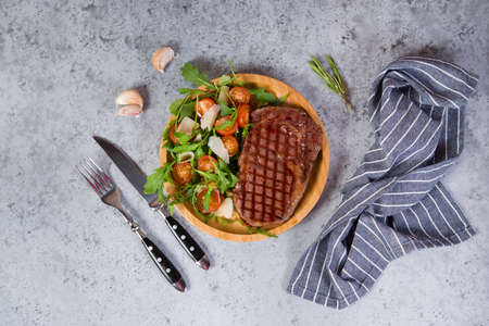 Grilled beef steak with fresh arugula, tomato and Parmesan salad on a plate on a grey concrete background. Horizontal photo. Top view.