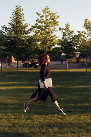 Young hipster girl with curly hair dressed in black dress and sneakers holding in hands laptop is jumping up.