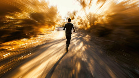 strong immunity concept. Silhouette of a man jogging down a misty forest trail with glowing lights on a moody autumn evening, evoking magic and inspiration.