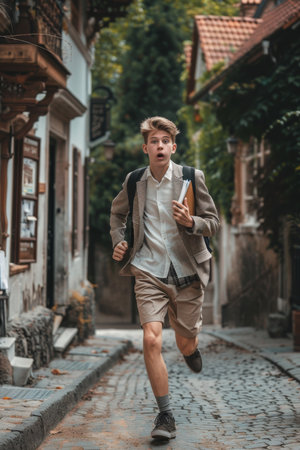 A man dashes through a train station, capturing the essence of urban life and travel urgency. The red train moves in the background, enhancing the dynamic motion.