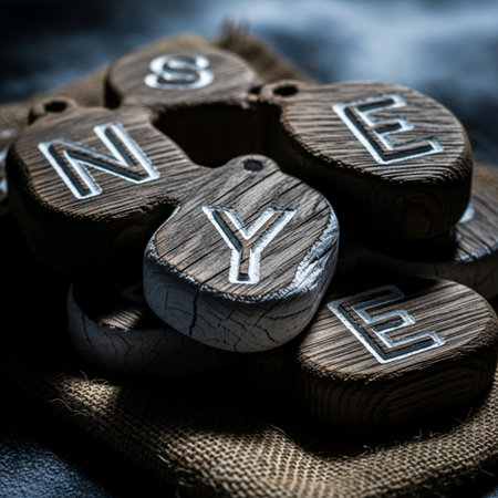 A closeup of ancient Norse runes from the Futhark alphabet, stones with symbols used in Wicca and other magic and for divination, on a light background with a place for text