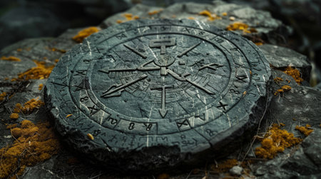 Ancient runic stone background with mysterious carved symbols on weathered gray rock.