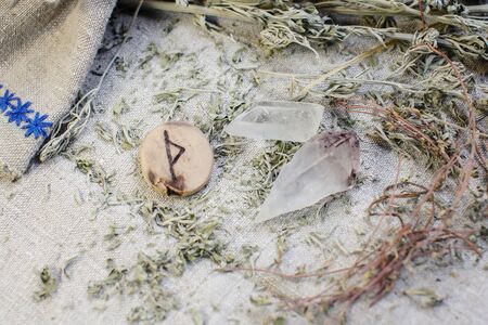 Scandinavian wooden rune Thurisaz, Thurs on a rough linen cloth with amethyst crystalline, rock crystal and dried wormwood.