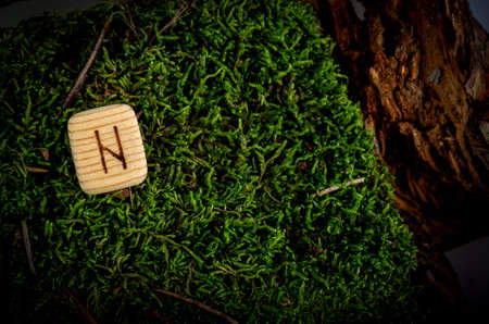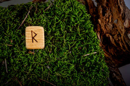 Raido rune, inverted position. Rune carved from wood. The rune is lying on moss and bark. The runic symbol is burnt on a piece of wood.