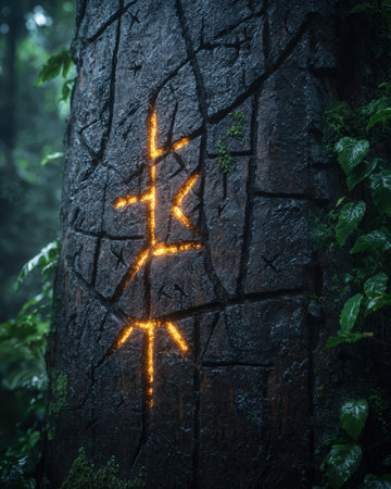ancient runic symbols meticulously carved into a dark, weathered wooden surface. A vibrant red light emanates from the carved grooves, creating a mystical and eerie glow. The texture of the wood is rough and aged, suggesting a long history and a sense of mystery. The composition draws the viewer into a of ancient lore and arcane knowledge, with the glowing runes hinting at hidden power or forgotten rituals.