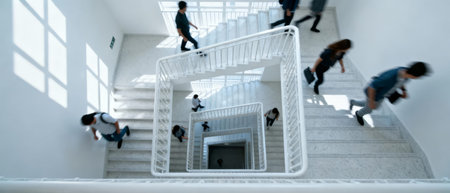Modern Stairwell Overview, Contemporary Design Showcasing Flowing Connectivity Between Floors, Elevated Perspective Of Sleek Stairwell Emphasizing Rhythm And Spatial Harmony
