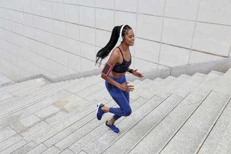 Beautiful young fit african sportswoman wearing wireless earphones running at the stadium