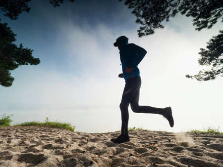 Morning training at lake. Running man at sunrise. Morning jogging on the beach or coast of river