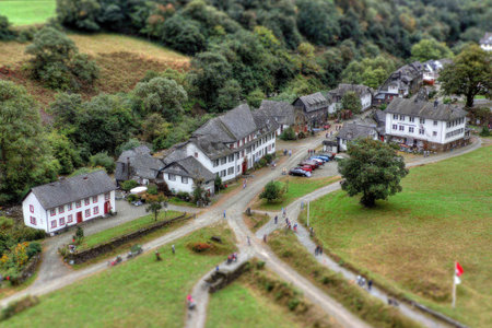 Expansive view of a quaint European village, showcasing the layout of the houses, roads, and surrounding natural environment. The village is nestled in a valley surrounded by trees and hills. Cars are parked in a designated area within the village.