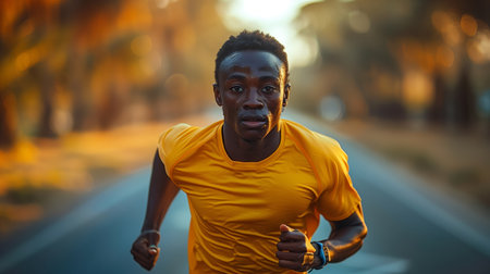 Portrait of a young African runner man in a yellow t-shirt running at the African Games competition