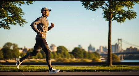 A man running in a park with a city skyline and bridge visible in the distance. He is wearing a cap, long sleeves, and athletic shoes.