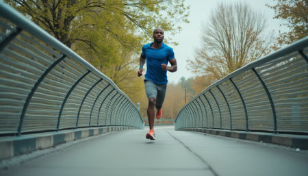 A determined Black man sprints along a modern bridge, surrounded by lush greenery and autumn hues. His athletic attire and intense expression convey a sense of purpose and vitality, embodying the spirit of outdoor fitness.