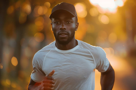 Athletic man running on an urban track, showing dedication during sunset