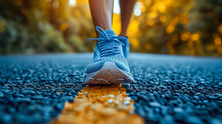 A solitary individual in sneakers stands on a track during sunset, surrounded by snack crumbs, symbolizing a journey in fitness and determination.