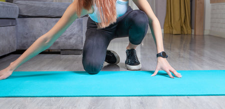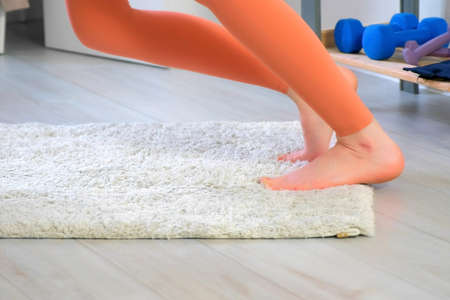 Woman in sportswear is warming her feet practicing youga doing exercises at home, closeup legs. Sport, fitness, training, stretching, workout, yoga and wellness concept.