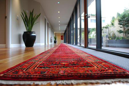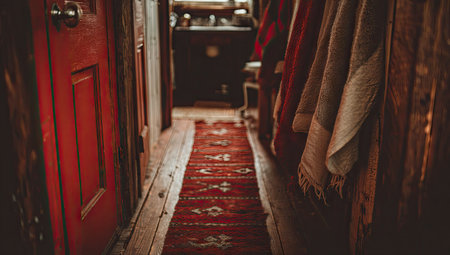 An interior shot showcases a narrow hallway with a red door and a patterned rug. Soft textiles hang on the right, contrasted by wooden textures. The warm color palette and soft lighting create a cozy ambiance. Suitable for various editorial and commercial projects, depicting home and lifestyle themes.