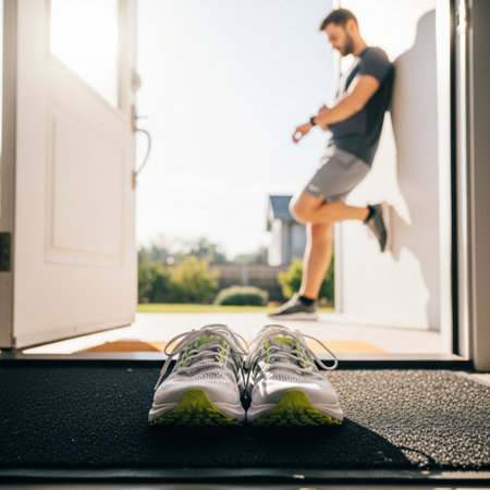 A person with short hair and glasses sits on a chair in the entryway, tying the laces of their beige sneakers. Sunlight streams in through the door, highlighting the daily routine of getting ready to leave the house.