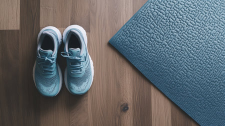 A modern pair of blue sneakers rests on a wooden floor beside a textured exercise mat, perfect for fitness, workout, and yoga practice at home.