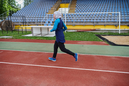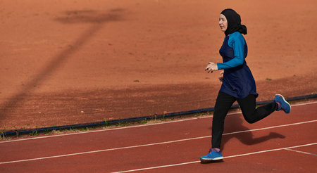 A muslim woman in a burqa sports muslim clothes running on a marathon course and preparing for upcoming competitions