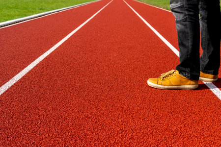 Man in brown sneakers and black jeans standing on a red running track. Copy space for your motivation quote.
