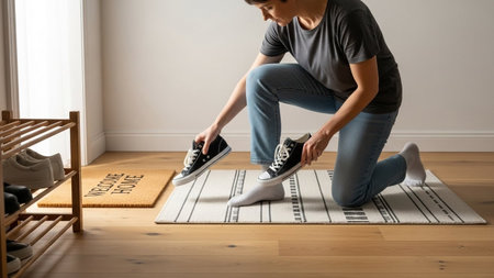 A woman kneels on a striped rug in a home entryway, putting on black high-top sneakers, preparing to leave. A wooden shoe rack and Welcome Home mat are nearby, depicting daily routine and domestic life.