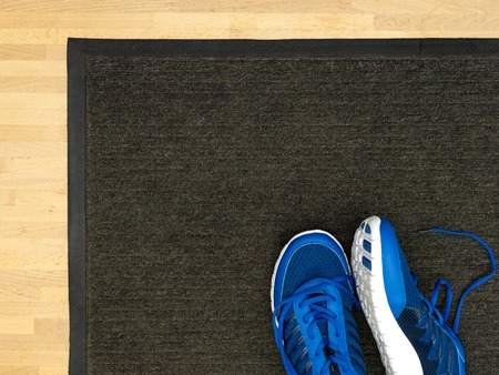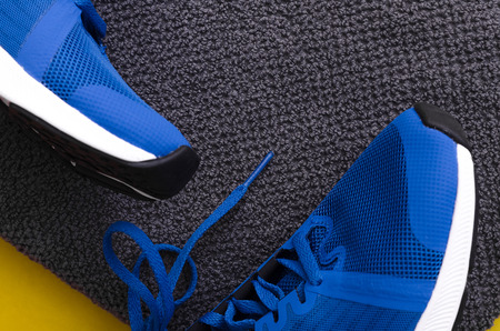 Sports shoes on a fitness carpet. Fitness carpet and shoes. Blue shoes and blue carpet. Top.