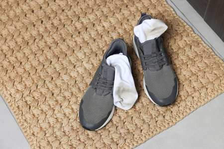 Sneakers with dirty socks on woven mat indoors, closeup. Space for text