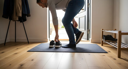 A man bends down to put on or take off his black sneakers in the entryway of a home. The scene captures a daily routine of getting ready to leave or arriving home, with a shoe rack and door visible in the background.