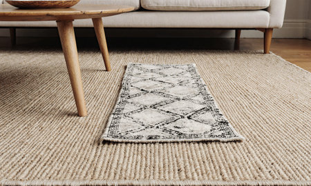 Layered Rugs Style. A low-angle shot of a living room floor where a smaller, patterned vintage rug is layered over