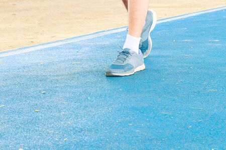 running feet male in runner jogging exercise with old shoes for health lose weight concept on track rubber cover blue public park. copy space add text